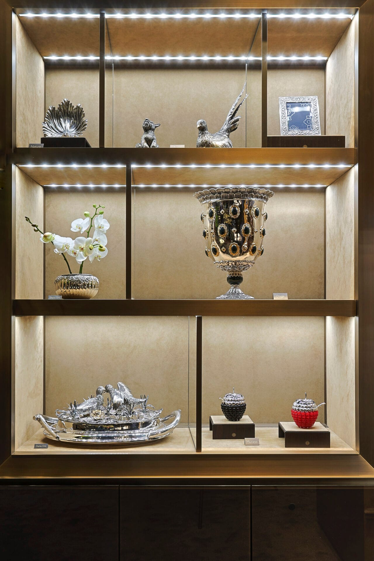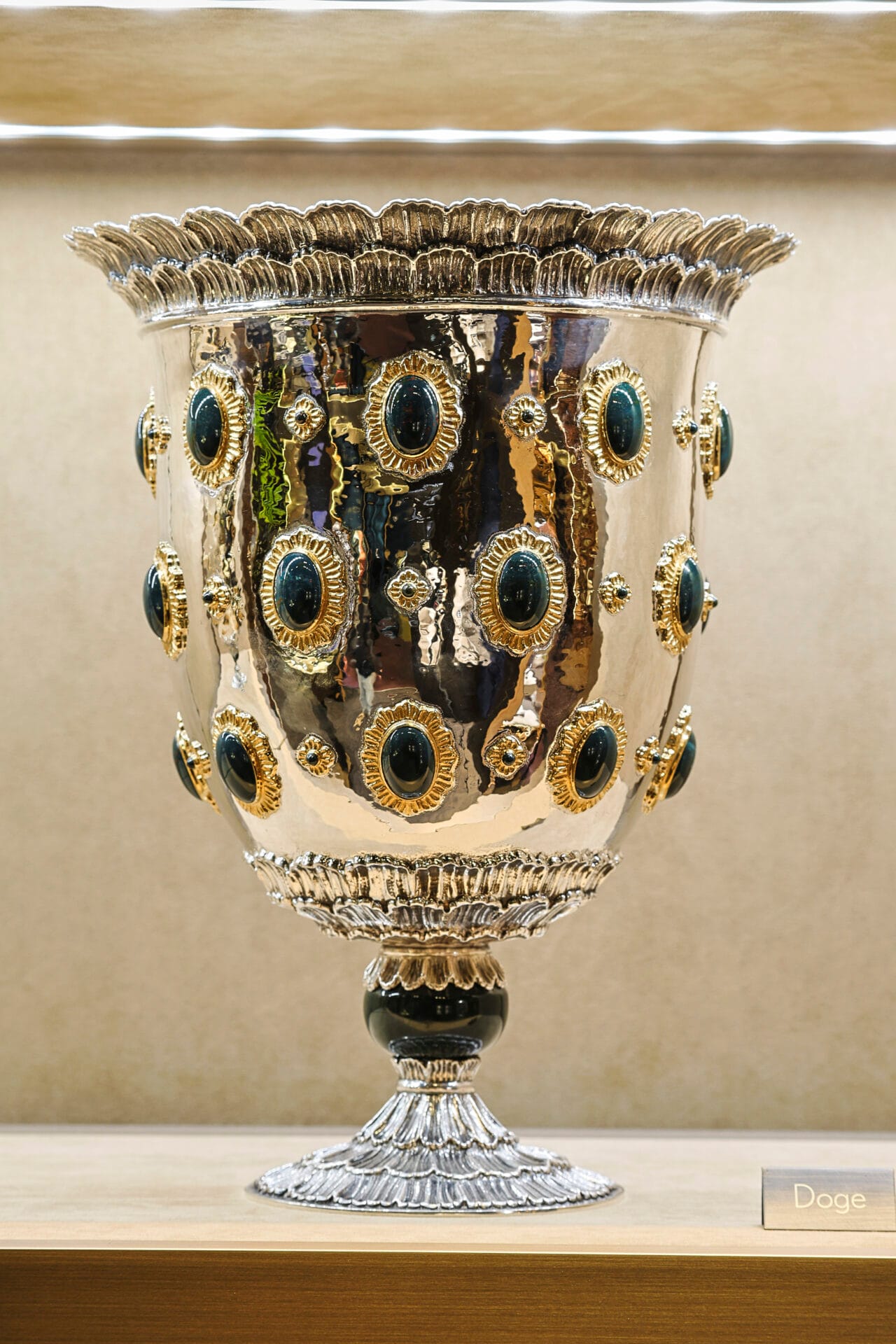 L’argenteria intarsiata di Buccellati, con la sua abile costruzione e le combinazioni di materiali, richiama opere di architettura. La collezione Doge, introdotta da Gianmaria Buccellati negli anni ’70, include centrotavola, vasi, candelabri e cornici, dove l’argento accentua intarsi di lapislazzuli, malachite, corniola e perle osmeña, trasformandosi in