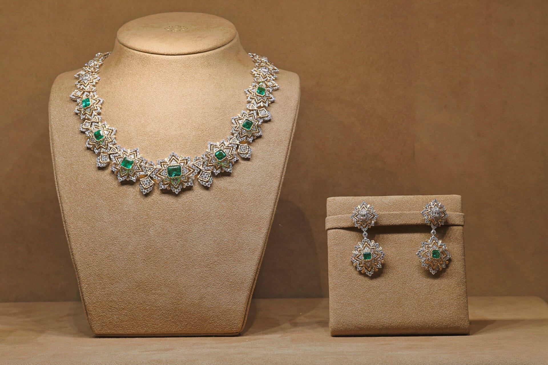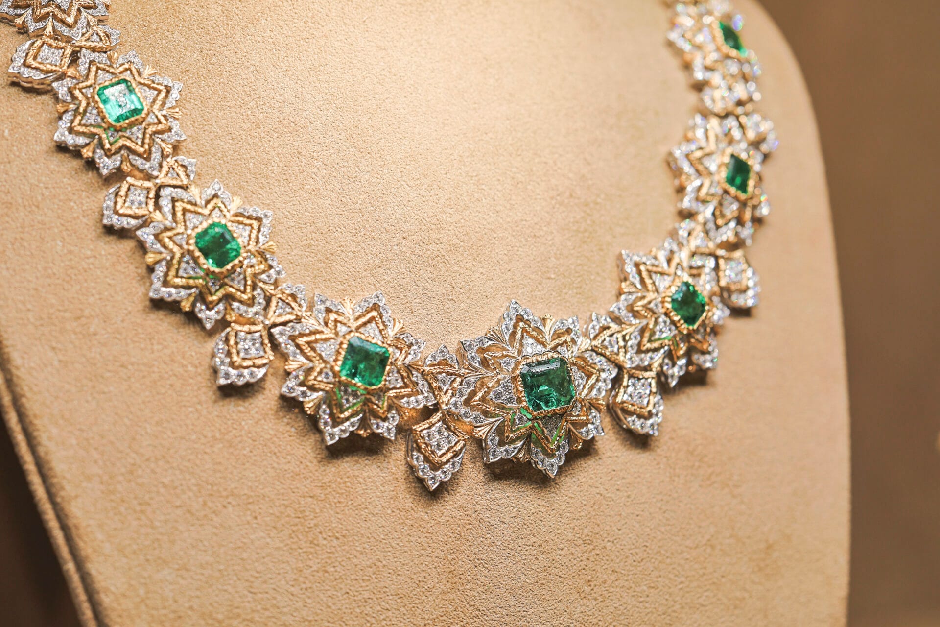 mosaici. Tra i pezzi di alta gioielleria che incarnano questa visione, spiccano alcune delle sue reazioni più iconiche come il bracciale rigido in oro giallo e bianco degli anni ‘60, impreziosito da smeraldi e diamanti; la collana degli anni ‘70 in oro giallo e bianco con Tormaline e Diamanti, dal design audace. La Visione Contemporanea di Andrea Buccellati: La Collezione Mosaico – Accanto all’eredità di Gianmaria, le creazioni più recenti presentate a TEFAF includono splendide parure della collezione Mosaico, disegnate da Andrea Buccellati, che reinterpreta i colori vivaci del passato attraverso un design più essenziale e moderno. I bordi in oro ispirati al rococò, ghirlandati e incisi, diventano più angolari, con una silhouette a geometria distintiva. Le forme floreali si trasformano in stelle o raggi di sole, e gli ornamenti rococò vengono decostruiti, resi più astratti.