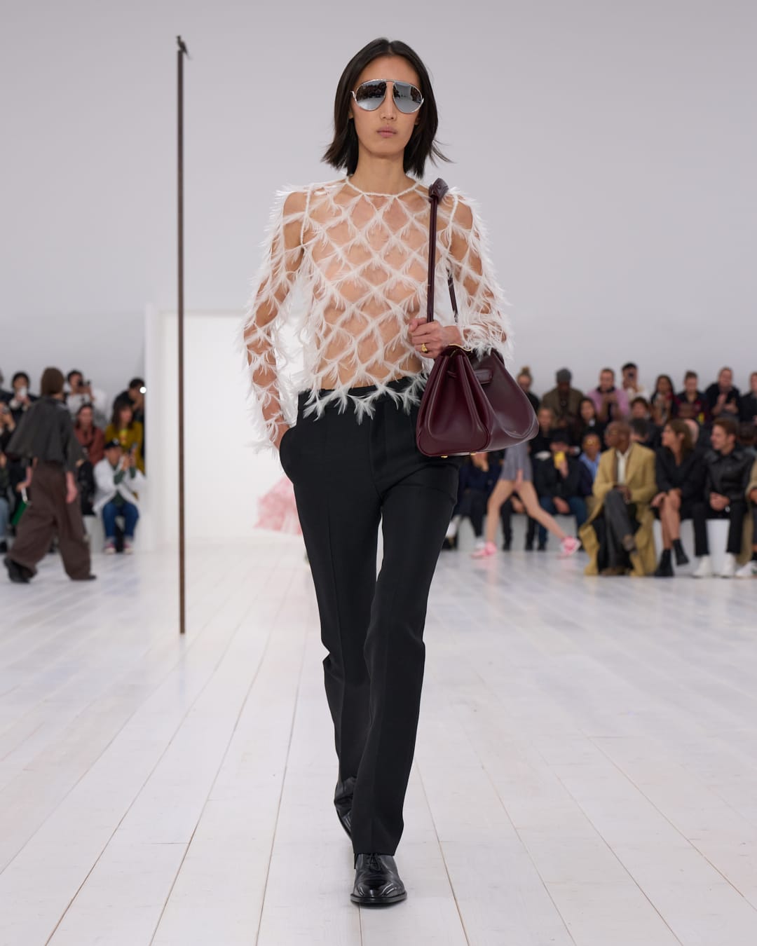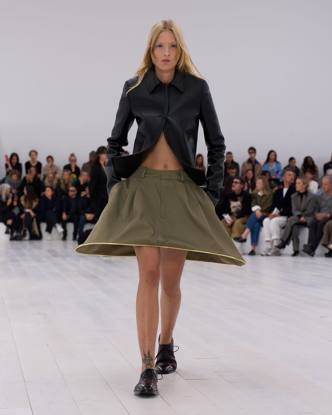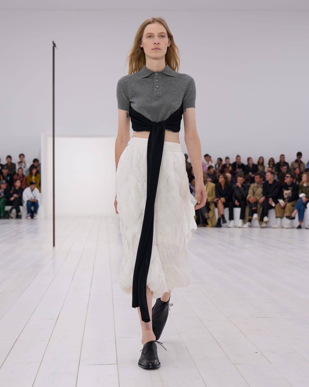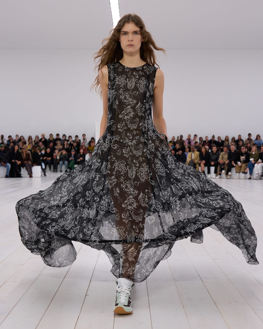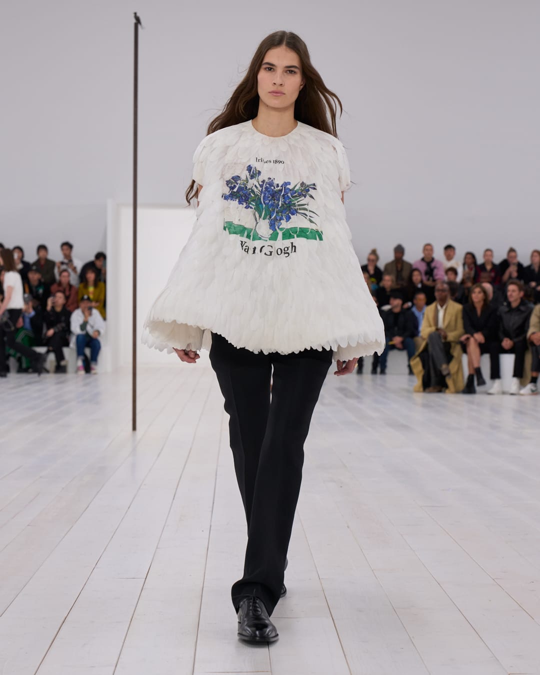 Crinoline e silhouette romantiche, leggeri tessuti floreali, drappeggi e orli rialzati, Jonathan Anderson, direttore creativo di Loewe, per la Primavera/estate 2025 rilegge lo stile dell’anno di fondazione della maison spagnola, il 1864. Un omaggio ai 160 anni dalla fondazione della griffe che Anderson dirige dal 2013, così delicata e moderna da meritare, alla fine della sfilata, una standing ovation.