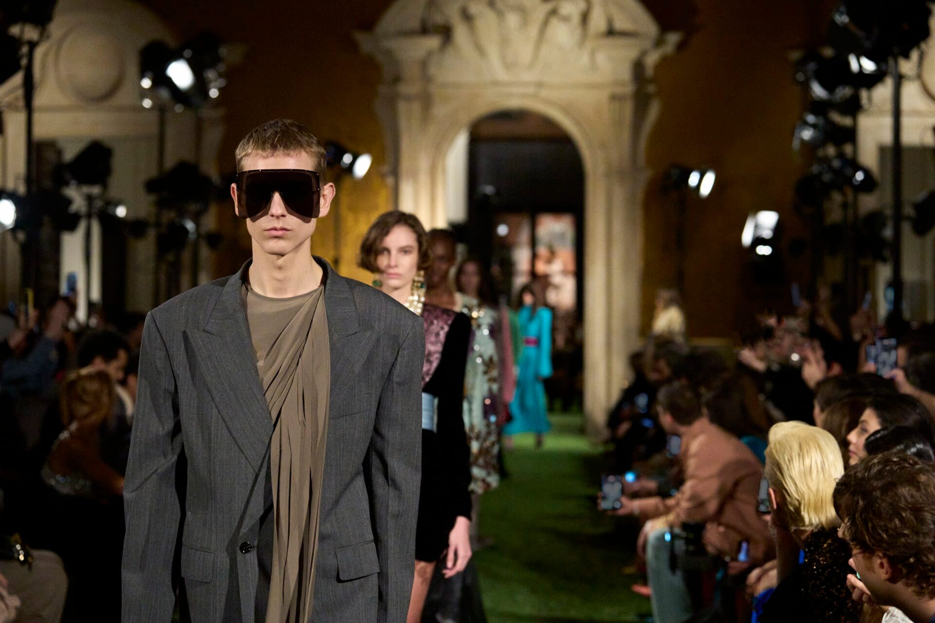 “Palazzo Barberini non è un’architettura pacificata – scrive infatti lo stilista sulla press realise rendendo esplicita la metafora tra Palazzo Barberini lui e la maison Valentino- ma un CAMPO DI CONFLITTO in cui più dispositivi concorrono a mettere in discussione la PRETESA di STABILITA’ DELLA FORMA. L’edificio non cerca una sintesi tra ORDINE E MOVIMENTO: espone la loro COESISTENZA FORZATA, la LORO FRIZIONE PERMANENTE, le INTERFERENZE che si generano nel loro sovrapporsi. In questo senso, il palazzo può essere letto, in chiave NIETZSCHIANA, come il luogo di una TENSIONE IRRISOLTA irrisolta tra un principio APOLLINEO scandito da misura, chiarezza e gerarchia, e un impulso DIONISIACO fatto di ebbrezza, slittamento e perdita dei confini”. “Ma io sono storto, un pò come Roma – rivela lo stilista – nata dritta e poi diventata col tempo meravigliosamente storta”. Quindi ecco il trionfo dell’imperfezione in passerella. La dissonanza che diventa bellezza. Il pasticcio di stili, anni Settanta, Ottanta, Novanta. Gli occhiali come bende che coprono mezza faccia. La sfacciata nudità dei corpi femminili. Tutto il resto è moda.