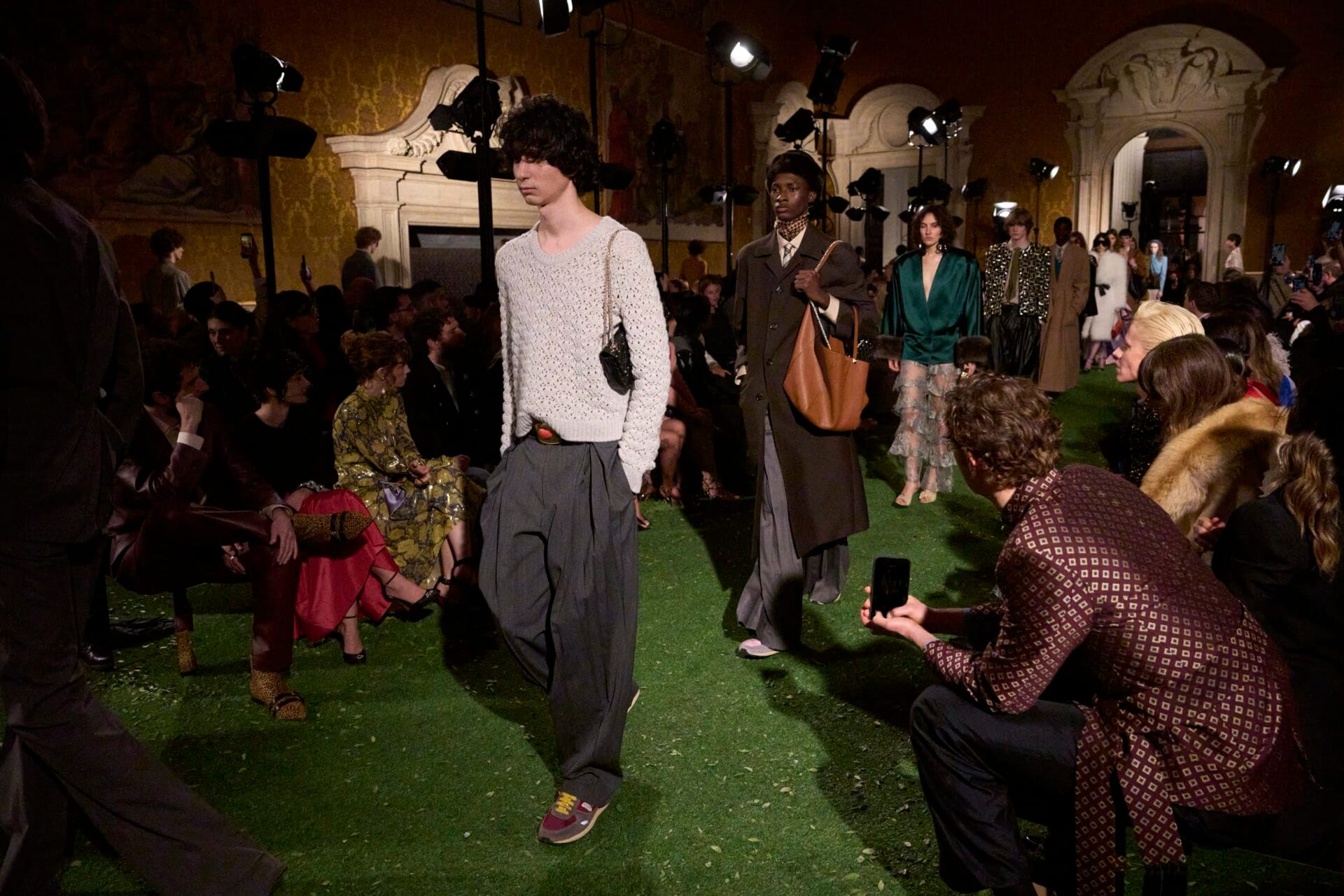 Se la proprietà della Valentino, dove tra l’altro da qualche anno è entrato il Gruppo Kering con l’acquisizione del 30% delle quote, ha deciso di voltare pagina, e ha di fatto mandato via il bravo Pierpaolo Piccioli, che comunque aveva portato con eleganza la maison nella modernità, quale ragione c’era se non quella di aumentare i profitti? Non a caso è stato scelto proprio Alessandro Michele, ex Gucci, per sostituire il couturier che ora dirige Balenciaga. Alessandro Michele è stato infatti colui che da Gucci, dopo un periodo negativo, seguito all‘addio del ceo Domenico De Sole e dello stilista texano Tom Ford, che insieme aveva riportato i fatturati di Gucci a livelli stellari, con la sua moda controcorrente aveva triplicato i profitti. Certo, Alessandro Michele è lo stilista che ha aperto la moda all’inclusione in passerella, alla fluidità, al no gender. Il suo stile può piacere e può non piacere, ma ha un grande seguito di giovani che lo adorano. A questo punto è inutile descrivervi gli abiti che hanno sfilato nelle sale del Palazzo museale su un finto prato di moquette. Li potrete vedere nella gallery dell’articolo.
