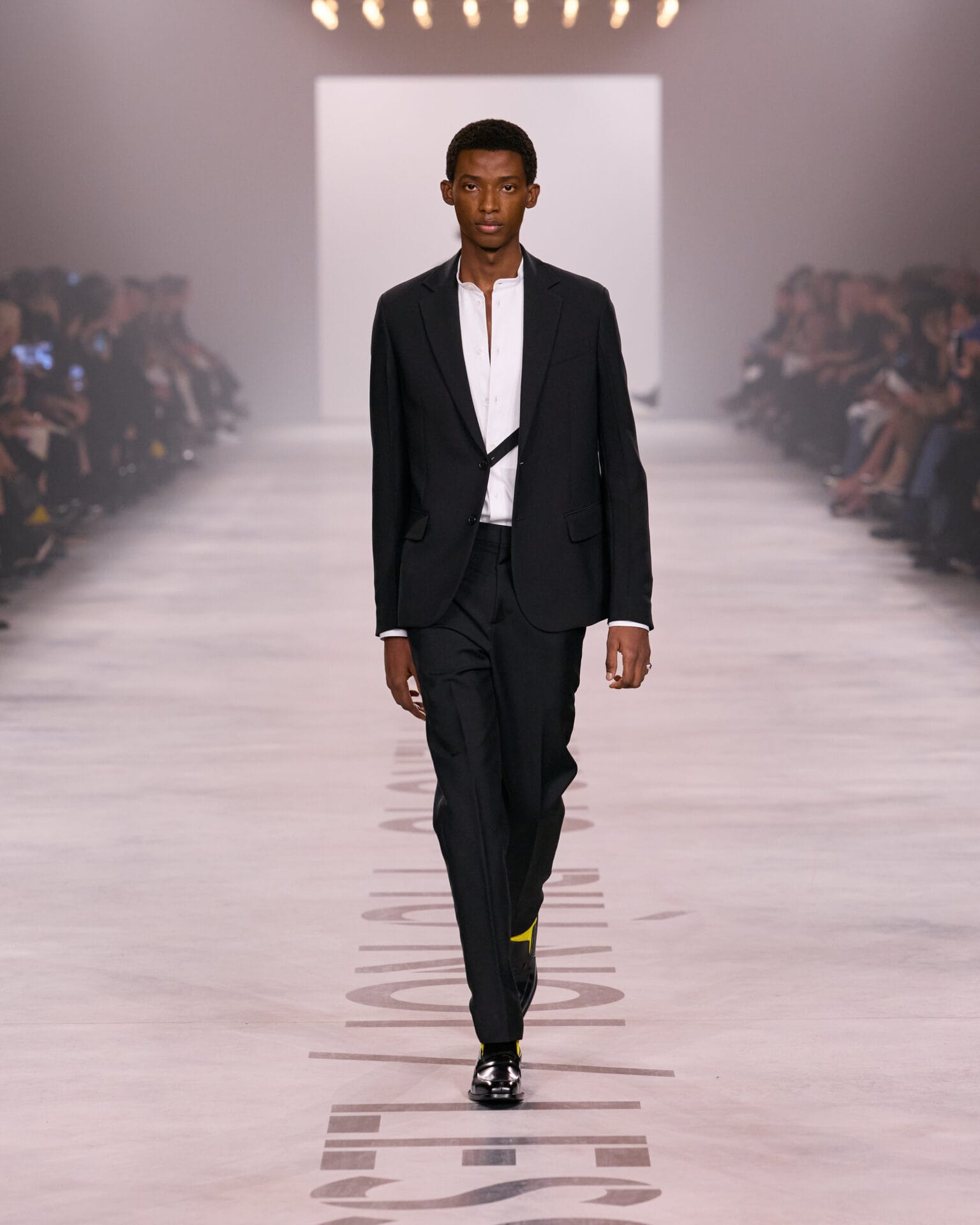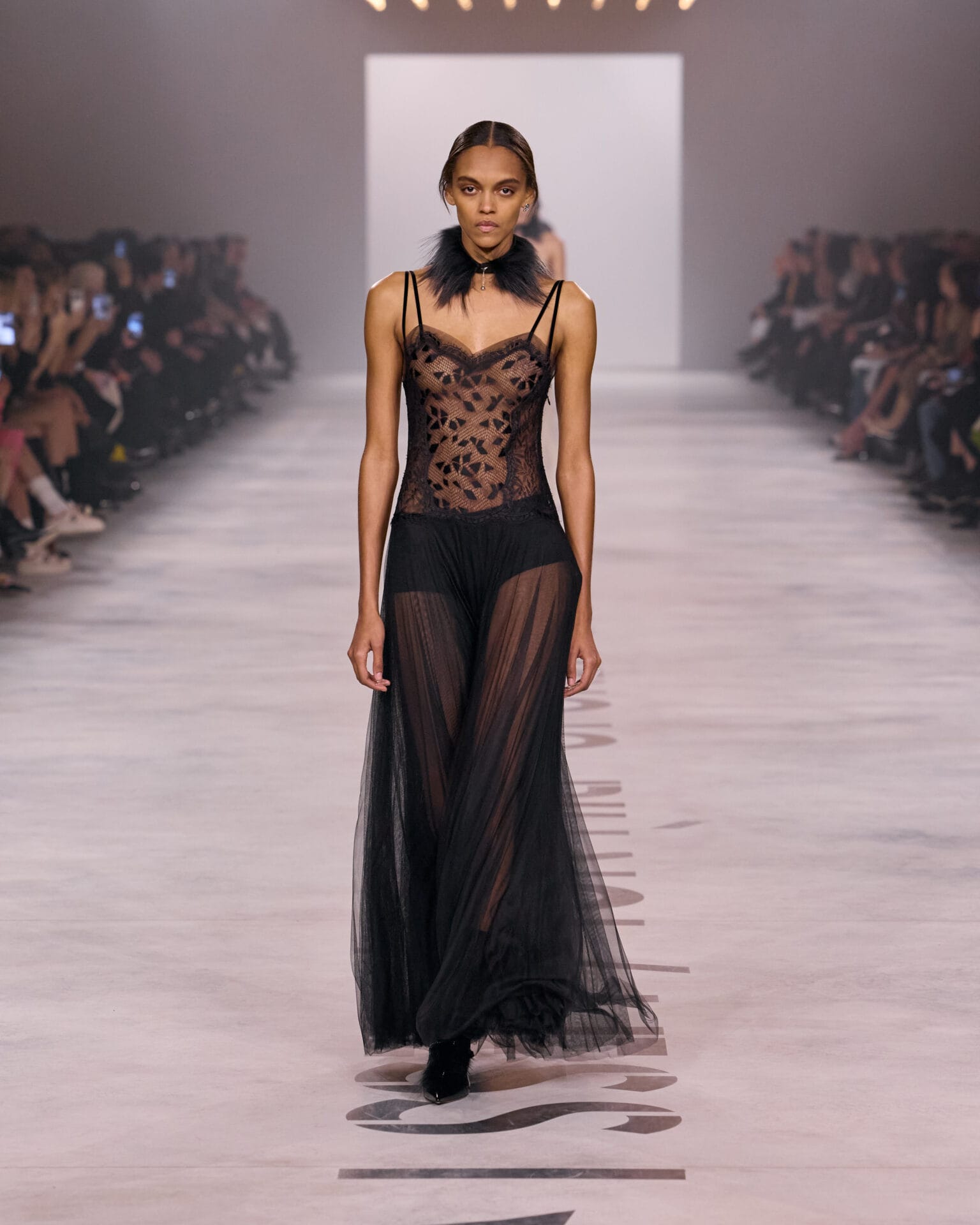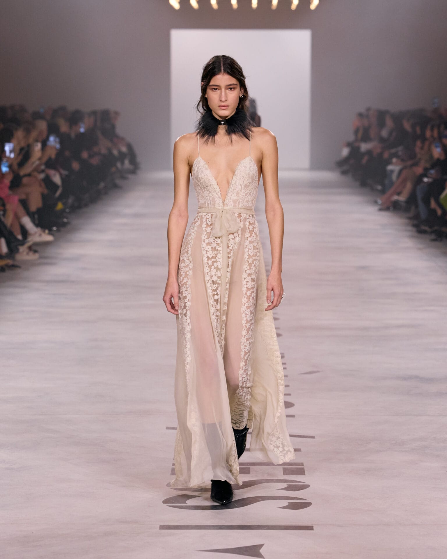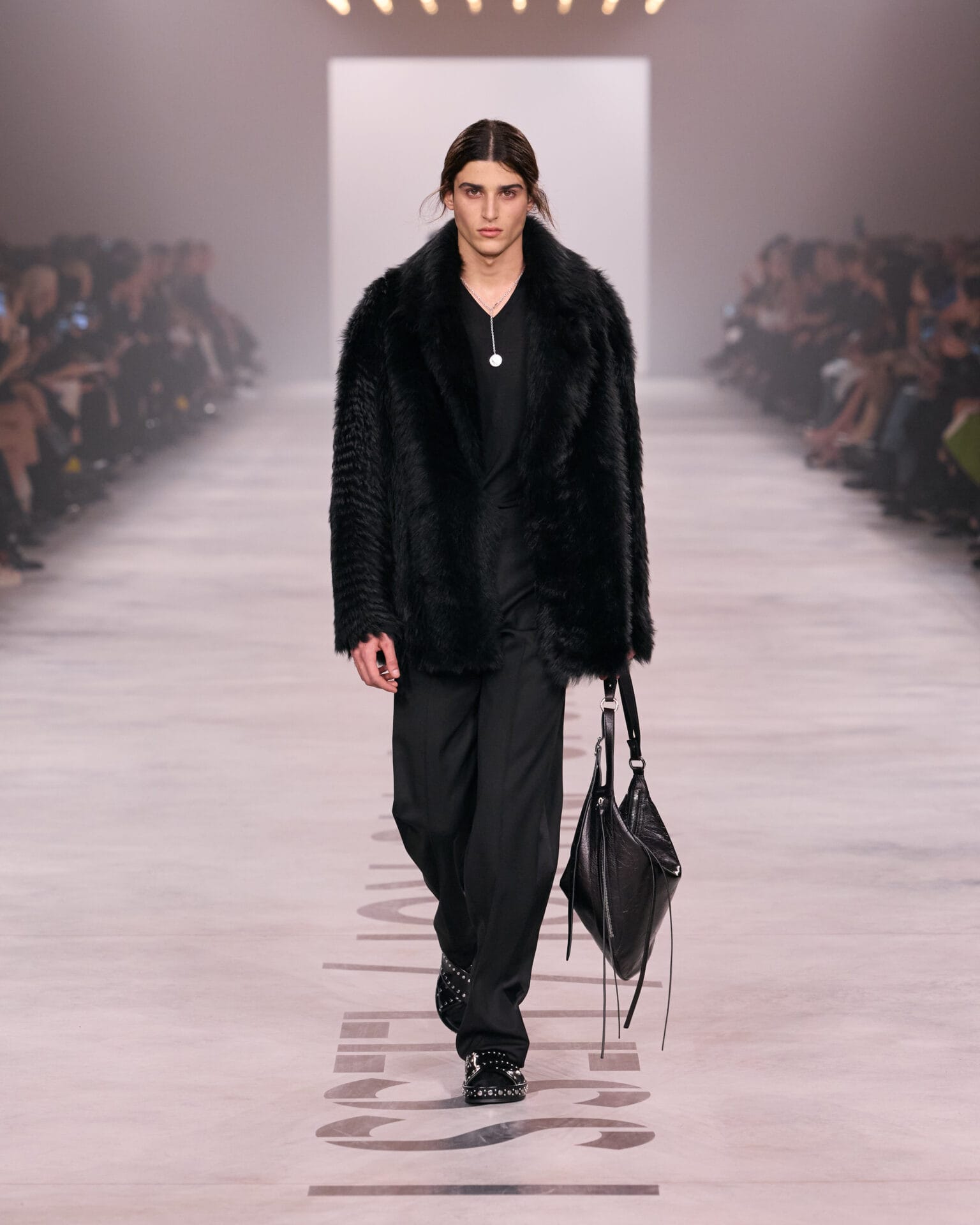 Davanti a un parterre de roi dove spiccano i volti di Uma Thurman, Jessica Alba e Monica Bellucci, sfila dunque l’essenza di Fendi: il nero, il beige, il pizzo intagliato al laser, le pellicce (“d’archivio” dice la stilista) alleggerite e trasformate per un effetto finale camouflage. Ritornano le iconiche Baguette, ricamate e in mille versioni, del resto sono le borsette fortunate di Fendi che hanno decretato dal 1997 il successo planetario della maison proprio nel periodo in cui i due giovani designer, Maria Grazia Chiuri e Pierpaolo Piccioli lavoravano in atelier. In pedana si alternano anche giacche e pantaloni che hanno lo stesso taglio per lui e per lei, blazer che utilizzano la fattura sartoriale e rigorosi completi blu inchiostro. Sfilano anche slip dress in set e vestitini di merletto trasparente a tratti. Soprabiti leggeri e trench in pelle si alternano a gilet, creando un’immagine moderna e sofisticatamente urbana.