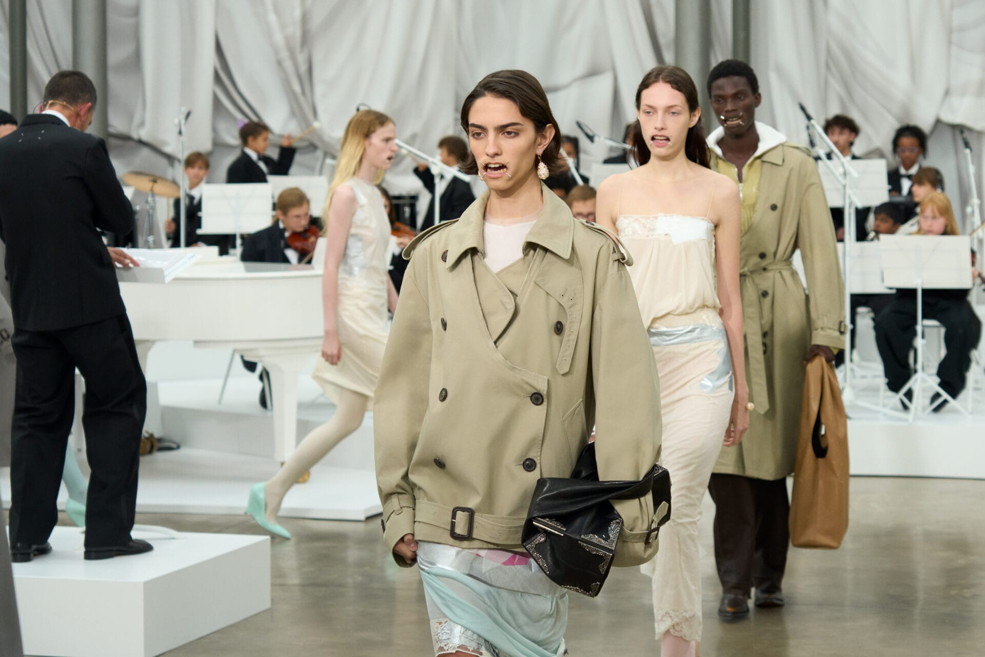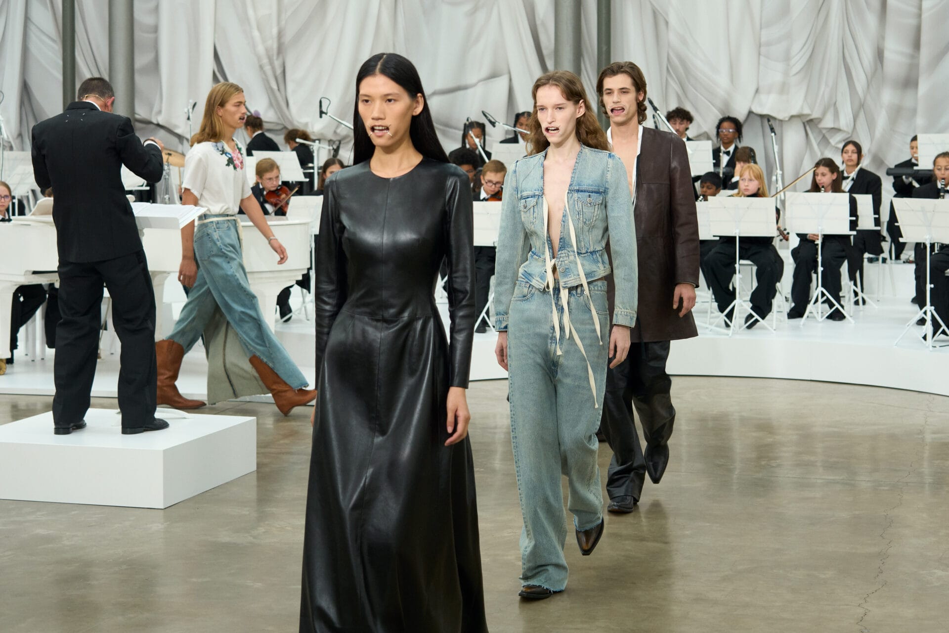 Glenn Martens ha anche riletto creativamente il divaricatore della bocca del dentista trasformandolo in un discutibile accessorio per la bocca (mouthpiece) di modelli e modelle, che hanno sfilato accompagnati dalle note classiche di Mozart e Bizet suonate da un’orchestra di sessantuno musicisti di età compresa tra i 7 e i 15 anni, provenienti da Romilly-sur-Seine e riuniti dall’associazione Orchestre à l’École. La trovata forse allude allo show della Primavera Estate 1989 che si svolse in un parco giochi nella periferia di Parigi, dove i bambini del posto divennero parte integrante del fashion show.