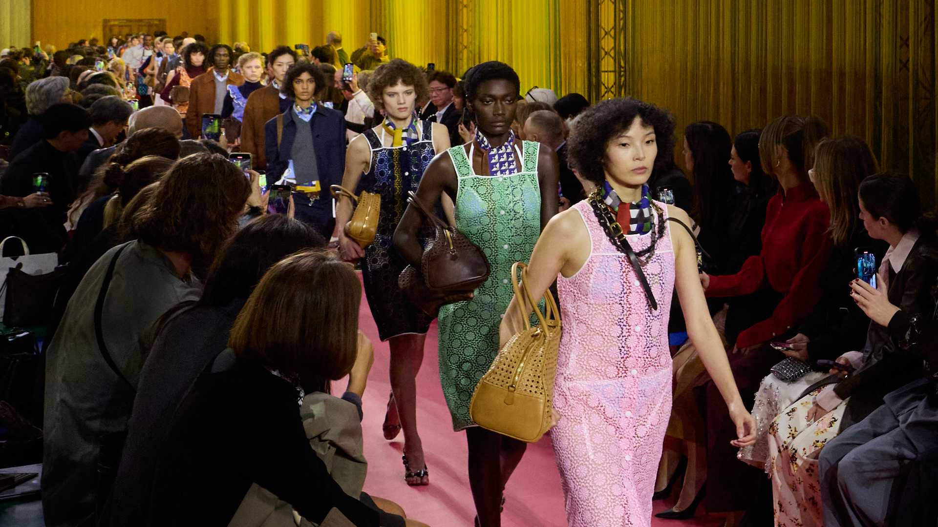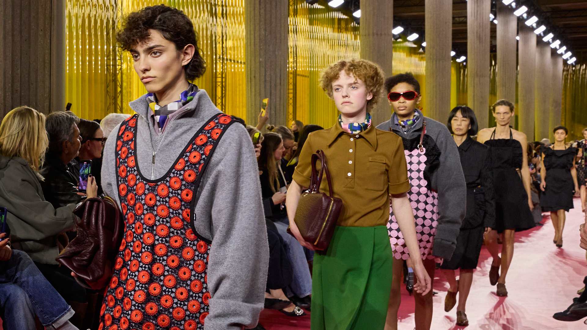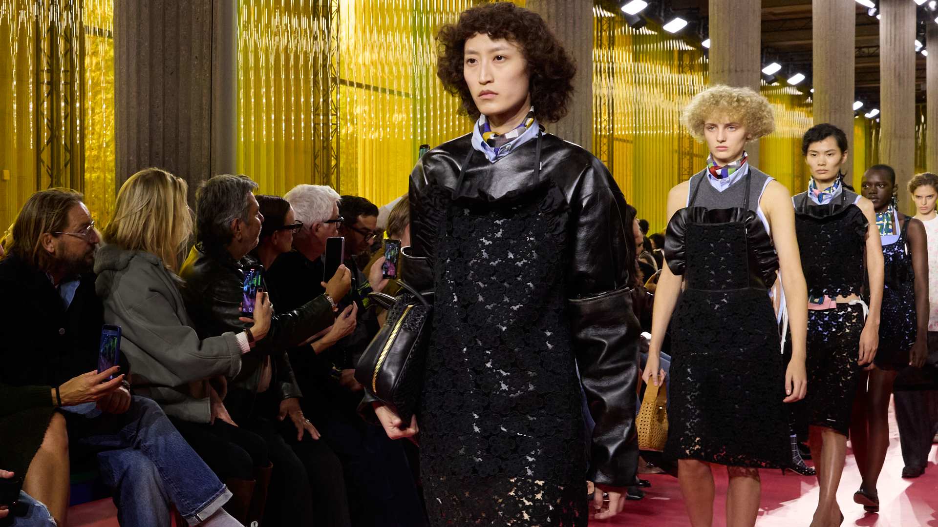 Da Miu Miu il grembiule è al centro della collezione e viene addirittura nobilitato. Negli spazi del Palais d’Iéna, anche i tavoli di formica dell’allestimento alludono all’immaginario domestico. L’uniforme però è qui perchè richiede una verifica sull’emancipazione femminile. La lettura del messaggio è affidata all’accostamento dei materiali da lavoro a quelli della sartoria, come drill e pelle che incontrano tessuti femminili come cloqué di seta e pizzi ricamati. Le rouches perdono la funzione frivola per diventare elementi di struttura, scivolando anche nel maschile destabilizzando i confini di genere. Il grembiule si allunga in abito, si accorcia in mini dress, si abbina alle gonne dritte e ai pantaloni.