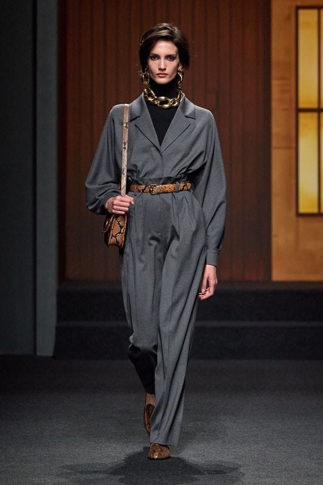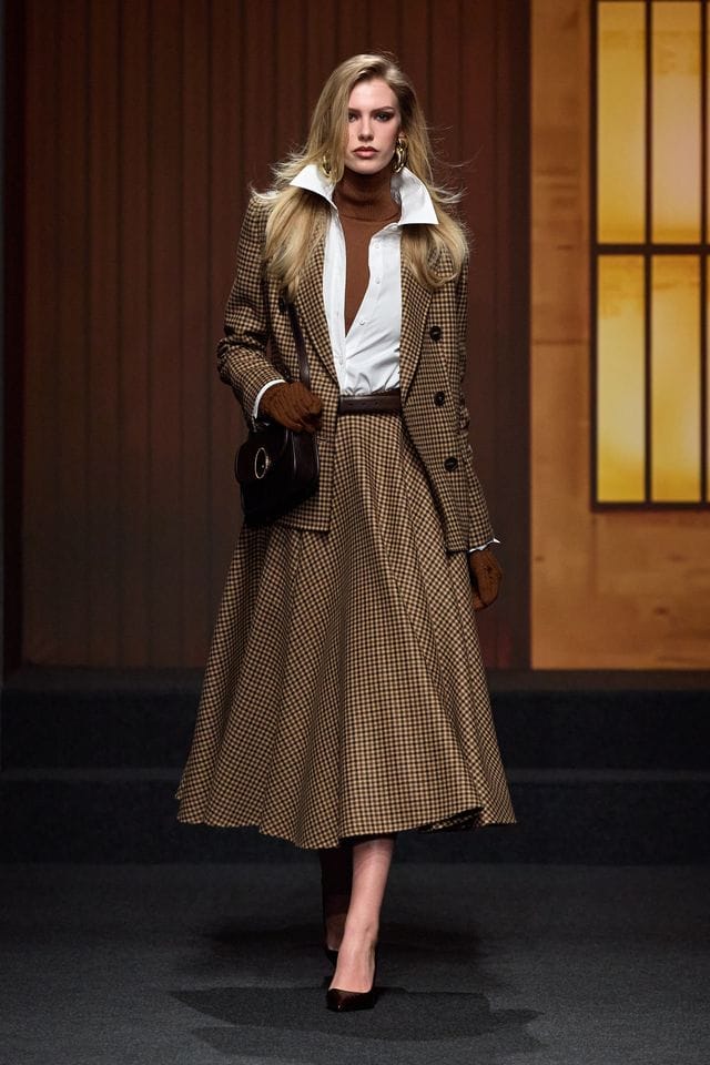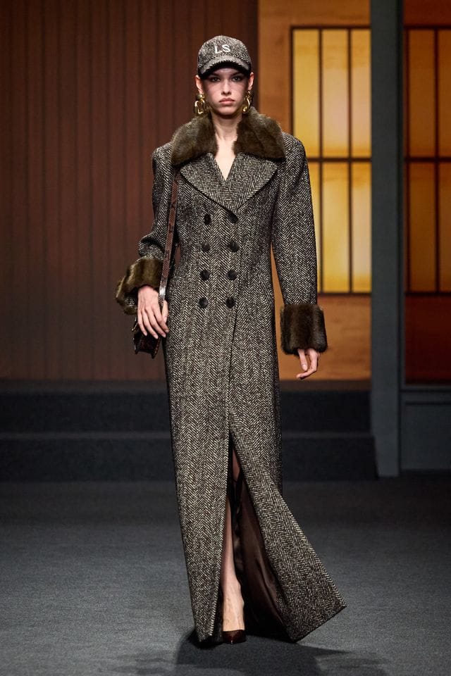 I cappotti sono avvolgenti, importanti, ma essenziali. Tweed, spinato, principe di Galles e loden sono lavorati in silhouette lunghe di aperta luminosità strutturale. Le spalle sono studiate, i revers sono precisi, le proporzioni sono millimetriche. Nulla è casuale.
