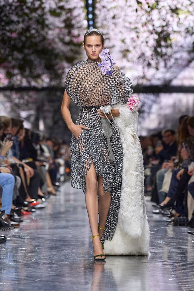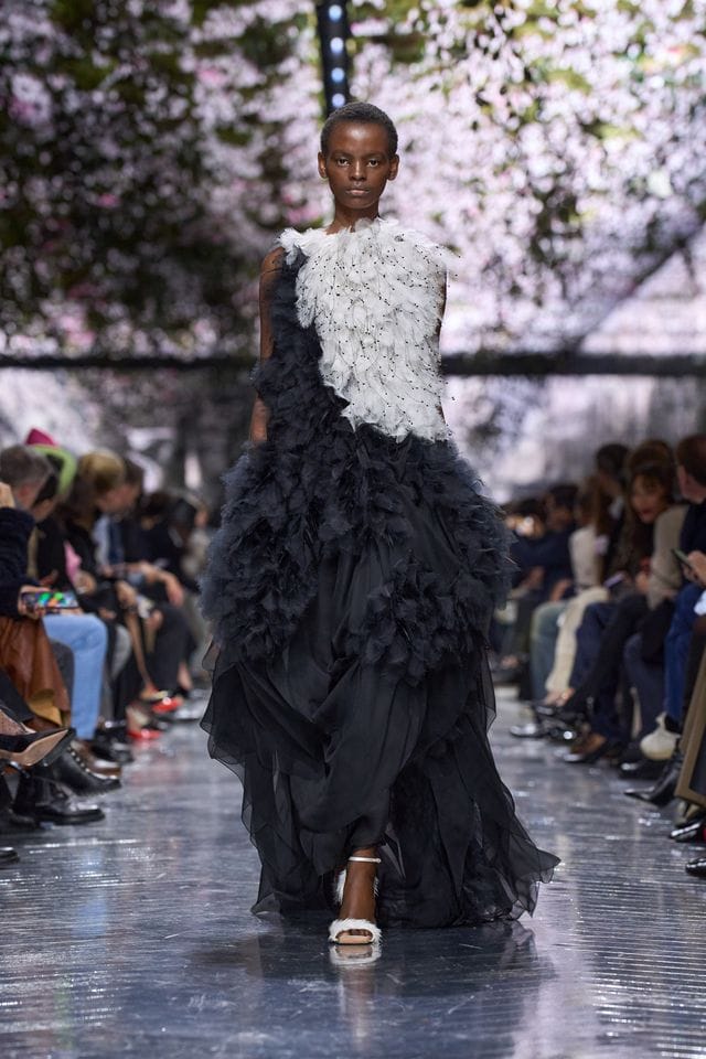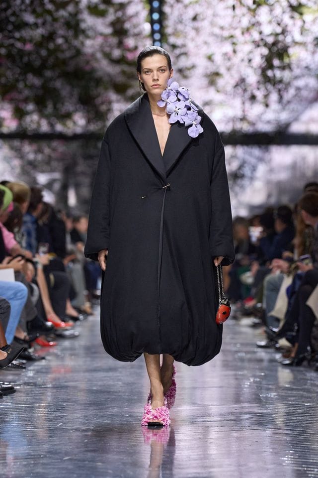 A pochi giorni dal debutto dell’uomo Anderson ha sfilato sotto ai bouquet di ciclamini, appena raccolti e donatigli da John Galliano, uno dei precedenti direttori artistici della maison, disposti sul soffitto come riflettori poetici di trasmissione creativa, allo stesso modo delle opere antropomorfe in ceramica dell’artista Magdalene Odundo. In questo scenario le linee degli abiti si muovevano fluidamente su tagli strutturati e drappeggiano delicatamente il corpo, ingrandendo le curve e enfatizzando il movimento. Una grammatica di nuove forme prende vita, arricchendo il lessico della maison mentre ne riecheggia le fondamenta.