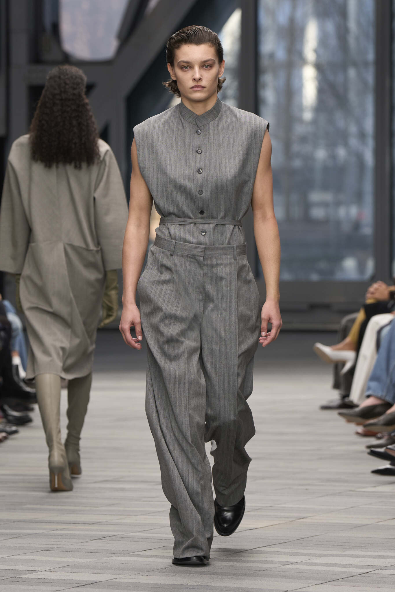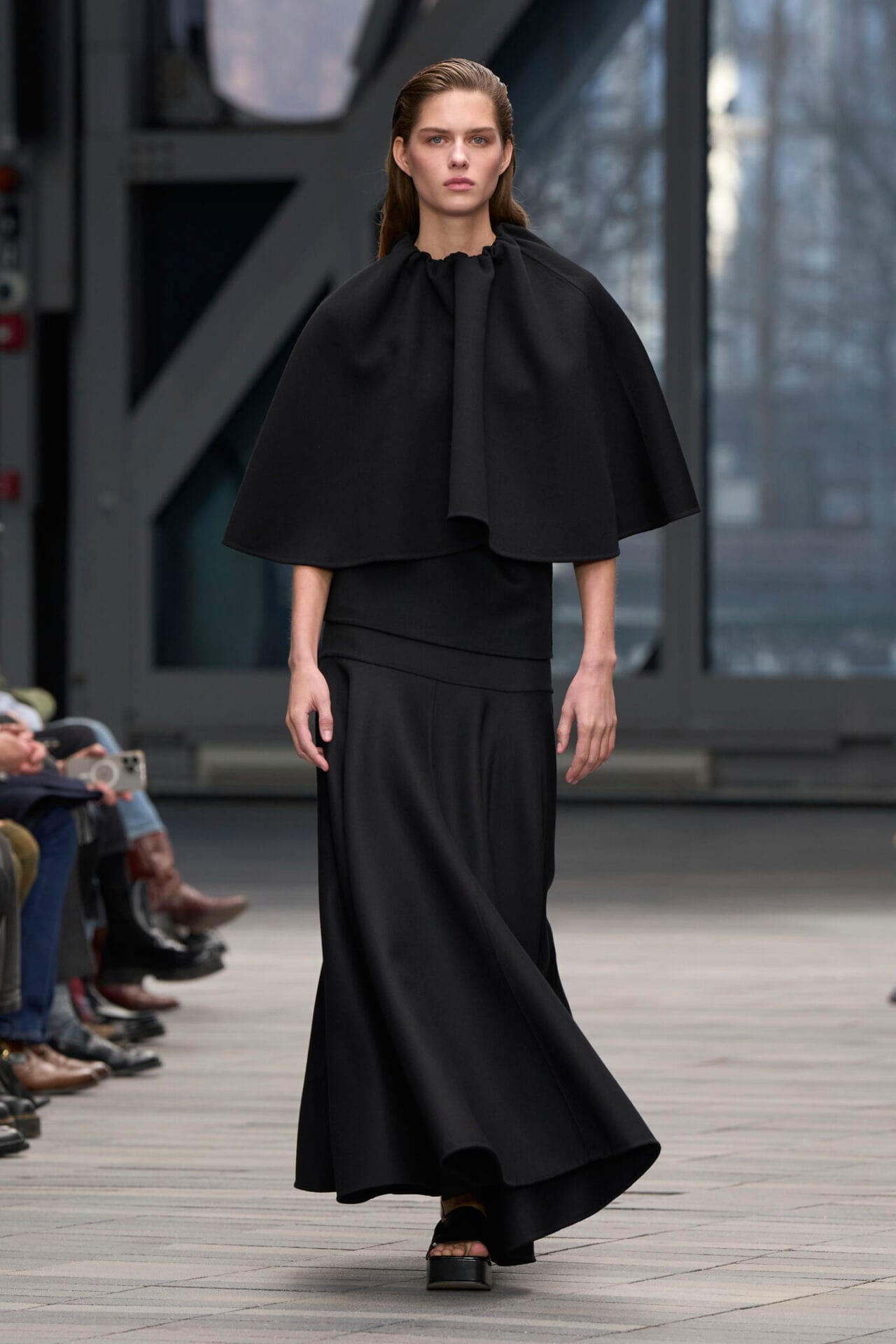 Attraverso le diverse proposte, la silhouette è slanciata e lineare. La silhouette è slim e precisa, con sorprendenti aperture sulla schiena e dettagli senza maniche, crea tensione, mentre alcuni abiti presentano retro essenziali che rivelano le strutture interne. I colletti bianchi emergono con forza, mentre quelli biker aggiungono un tocco ruvido. I colli in shearling suggeriscono grandiosità prima di ampliarsi sulle spalle del cappotto. Texture e colore definiscono uno scenario urbano fatto di neutri e tonalità attenuate, occasionalmente illuminato da accenti di tangerine o borgogna.