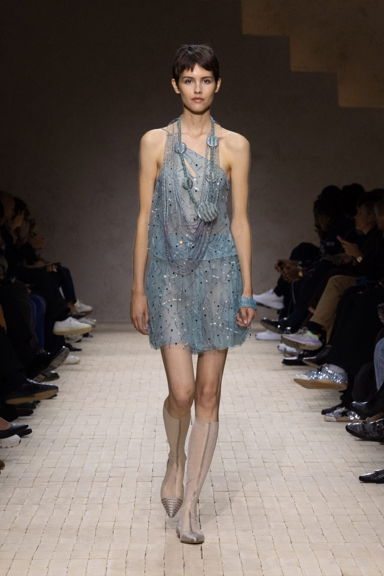 Il capo onnipresente per il giorno è il gilet, allungato, oppure corto a scoprire i fianchi. Ma per la sera lascia il posto a tuniche scintillanti di ricami, ad abiti in nylon impalpabile, a top tempestati di cristalli. La silhouette è fluida, dinamica, ma sempre composta, animata da variazioni cromatiche che si muovono dal beige al nero, passando per tonalità fredde e tocchi di grigio minerale.