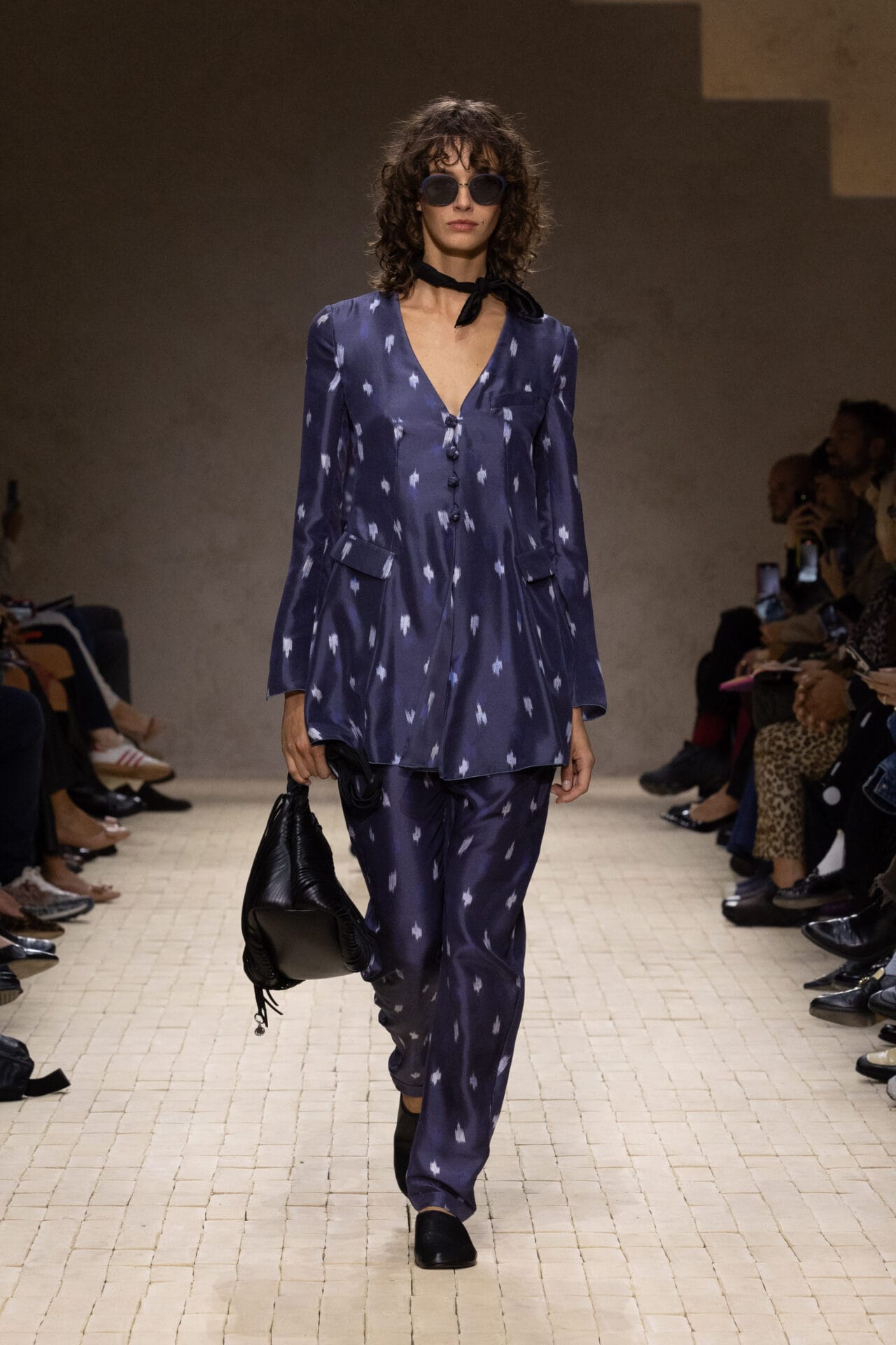 Così la collezione si compone di mises che ricordano terre lontane, che fondono come sempre Oriente e Occidente, motivi ikat, giacche morbide senza fodera e senza revers, pantaloni da harem, cinture obi, completi pigiama, parka e spolverini.