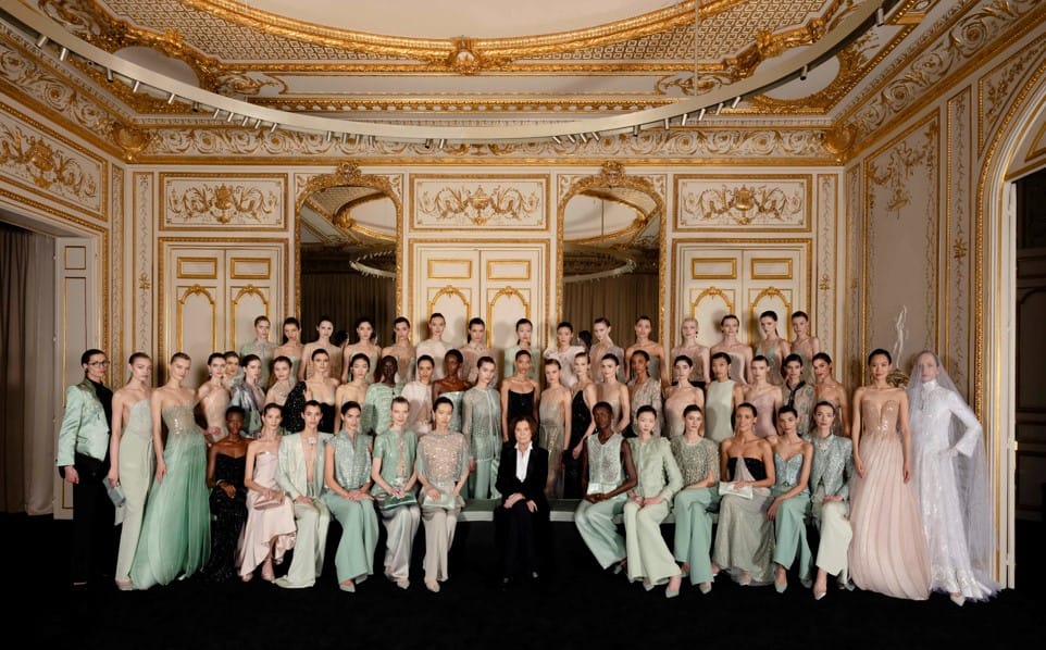 La collezione. L’evoluzione nel Privé si legge nel preziosismo che prende i toni delicati della giada: verde, rosa e bianco, contrastati dal grafismo del nero. L’armonia, di cui questa pietra dai colori unici è simbolo, si ritrova nelle silhouette liquide e verticali di rasi e sete. Tutto si appoggia con grazia sul corpo: i tailleur d’impronta maschile, le giacche precise e svuotate di struttura, i bustini ricamati indossati con pantaloni dal taglio maschile, gli abiti a colonna mossi da tagli e drappeggi sapienti, le tuniche longuette che si aprono